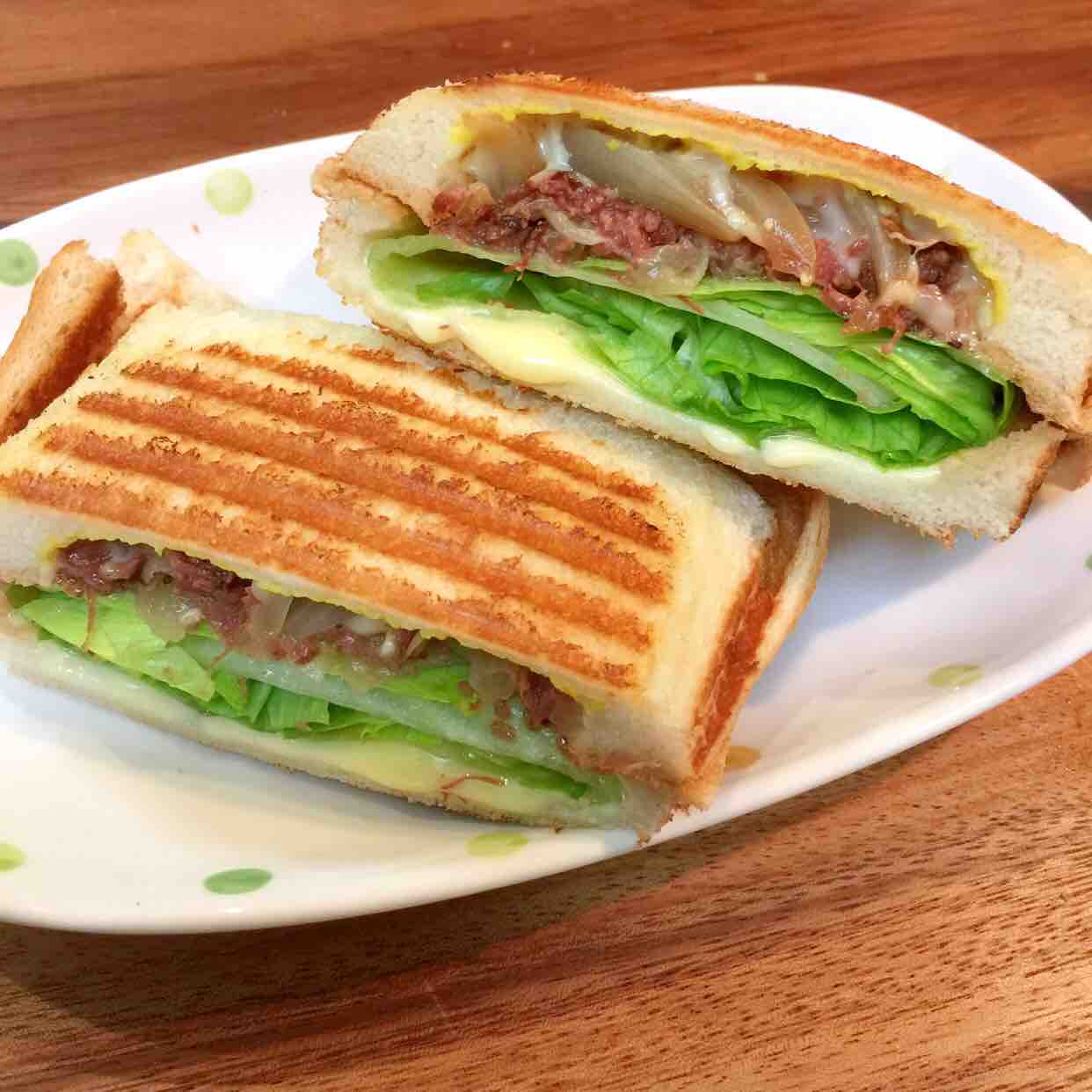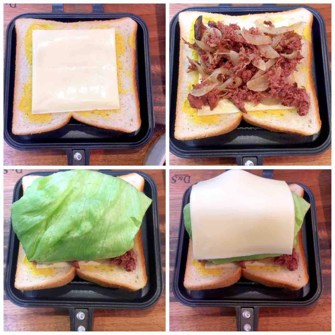 マスタード→とろけるチーズ→コンビーフと玉ねぎの炒め物残り→四角に畳んだレタス→もう1枚チーズ