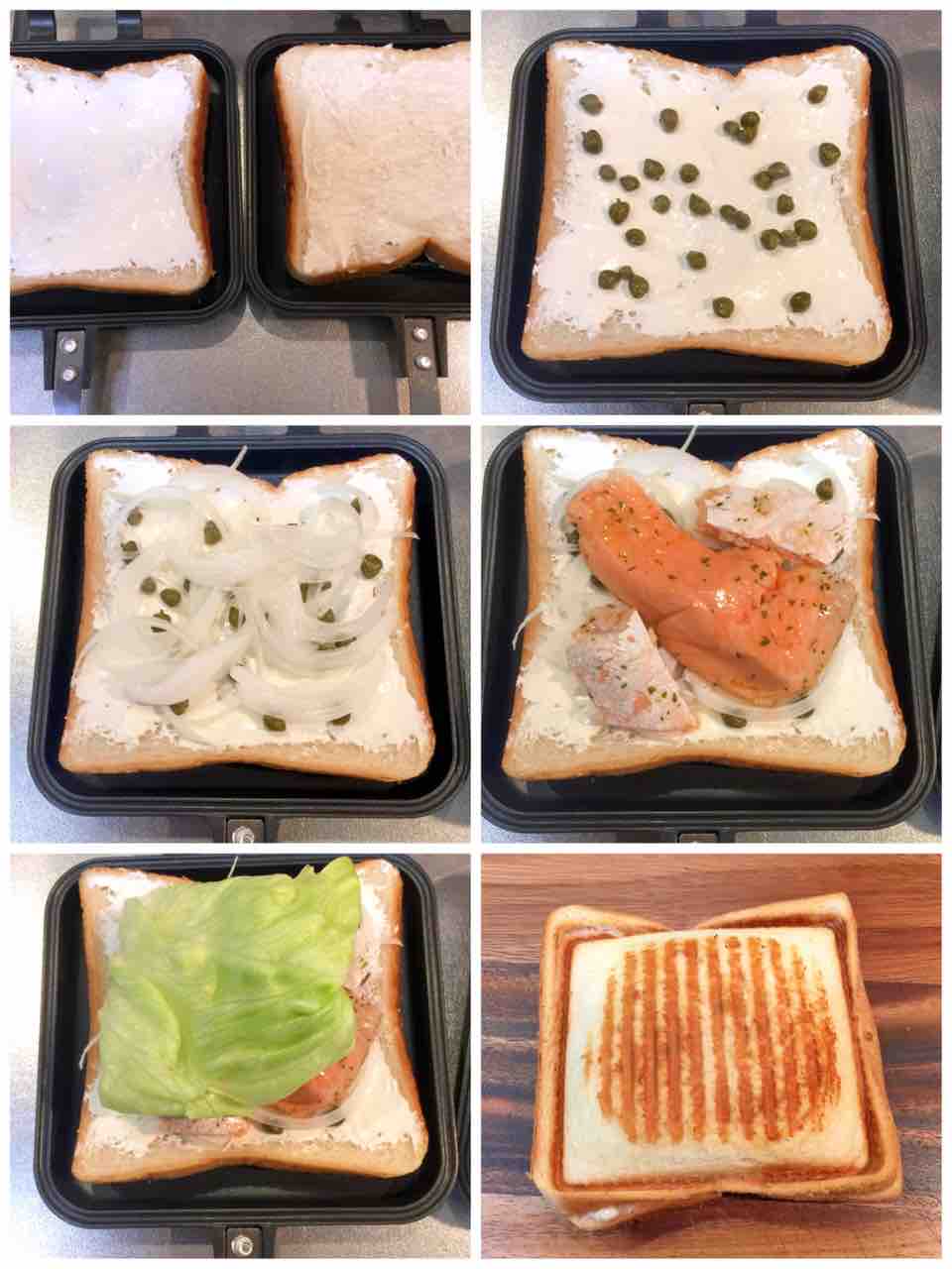 ケッパー→オニオンスライス→サーモン→レタスの順にサンド