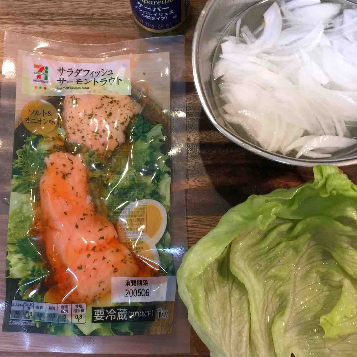 セブンのサラダフィッシュ サーモントラウト(ソルト&オニオン味)、水にさらした新玉ねぎのオニオンスライス、レタス