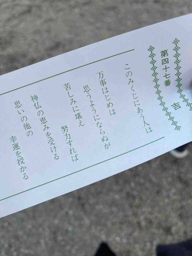 初詣とおみくじ ② 2018年01月15日 (つづき)旦那さんの大吉おみくじには、とても素敵な事が書いてありました。 思いの外、喜ぶMを見て、こちらも嬉しくなりました。テンションが上がって、子供みたいにはしゃぐオジサン(笑) パワーって!! 私は小吉でした。小でも嬉しい( ... 続きを読む (つづき)旦那さんの大吉おみくじには、とても素敵な事が書いてありました。 思いの外、喜ぶMを見て、こちらも嬉しくなりました。テンションが上がって、子供みたいにはしゃぐオジサン(笑) パワーって!! 私は小吉でした。小でも嬉しい( *´艸`) 「幸せの道が開ける」「足ることを知るは幸せの基」を心に留めて、今年を頑張ろうと思います。木には結ばずに、スマホケースに入れてお持ち帰り♪ 帰り際には、獅子舞に頭を噛んで貰いました(若いお兄さんが手に被った獅子舞です)「厄除け」の意味があるそうです。 子供達が怖がって、きゃーきゃー言ってるのが可愛いかったです♡ 今年の干支、戌の置物は仲間と一緒に飾りました。 ランキング参加中です♪ ぜひクリックお願いしますm(*_ _)m タグ :#初詣#おみくじ#獅子舞#大吉