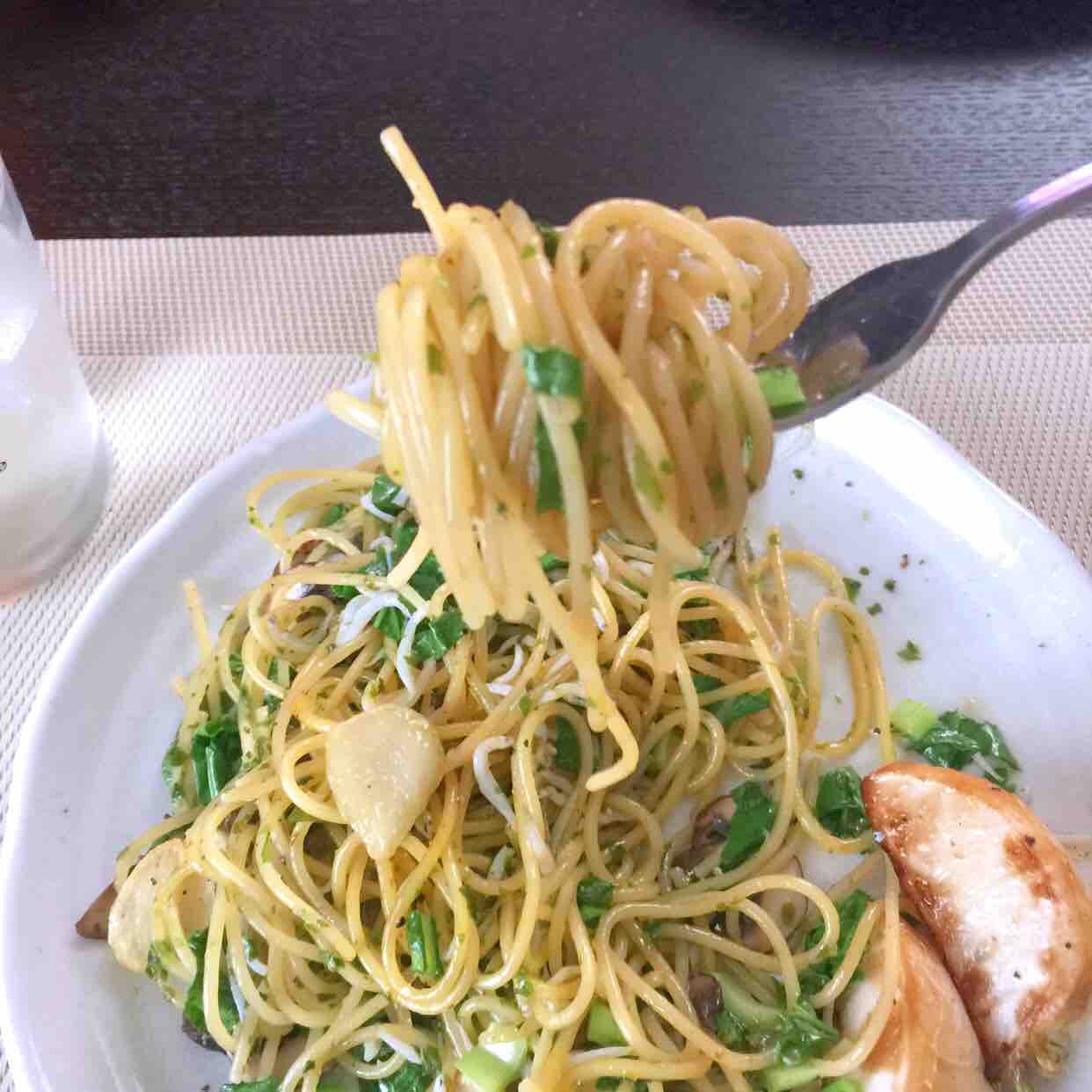 茹で上がったパスタと絡めて、かつお節、黒胡椒を振って完成