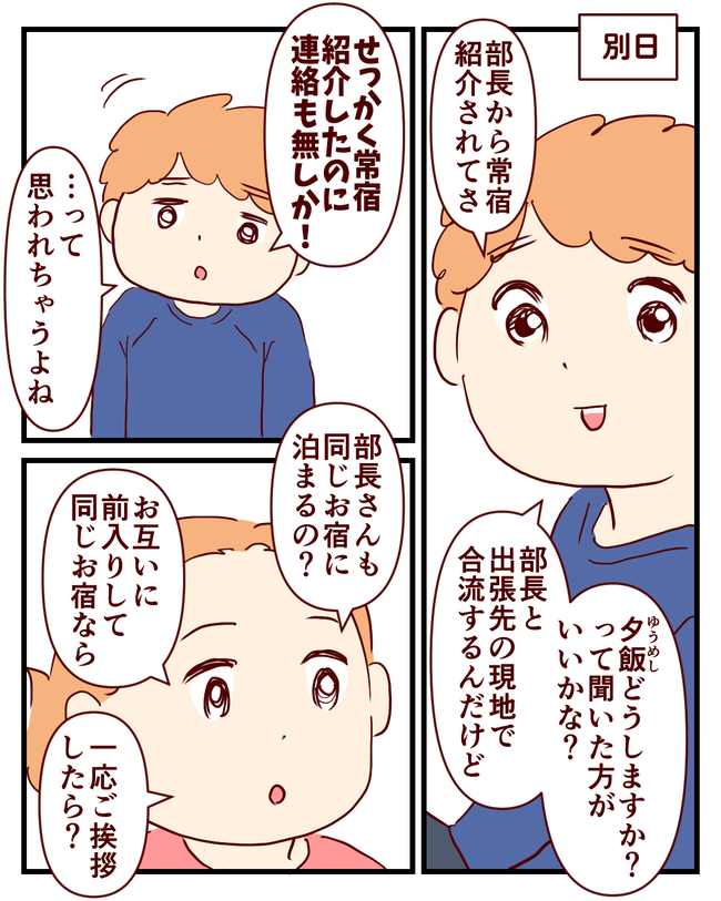 [出張編] 上にも下にも気を使う(前) 2023年04月26日 出張中は同行者や取引先の方と飲み会も多いM父親位の年齢の先輩とサシ飲み…なんて、若者からしたら苦行でしかないですね😓前に書いた、クラフトボスのCMを彷彿とさせるシチュエーションです(笑)堺雅人さん扮する先輩がコミュニケーションとして杉咲花さん達後輩を飲みに誘う ... 続きを読む 出張中は同行者や取引先の方と飲み会も多いM父親位の年齢の先輩とサシ飲み…なんて、若者からしたら苦行でしかないですね😓前に書いた、クラフトボスのCMを彷彿とさせるシチュエーションです(笑)堺雅人さん扮する先輩がコミュニケーションとして杉咲花さん達後輩を飲みに誘うけど、すげなく断られる…という内容↓見つけられませんでしたが「新しい風」シリーズのCM(つづく) ▼ 以前こちらの記事を出した際、新人社員寄りのご意見も頂きました。 その時にも説明しましたが、断ること自体を非難する意図はありません。全く悪いことじゃないですし、都合もありますし。ただ、私の価値感からすると「飲み会」に「残業代」を要求する新人は図太いなと思いました😓▼ my楽天room♪クリックして頂けますと嬉しいです♪ タグ :#出張#食事#飲み会#後輩