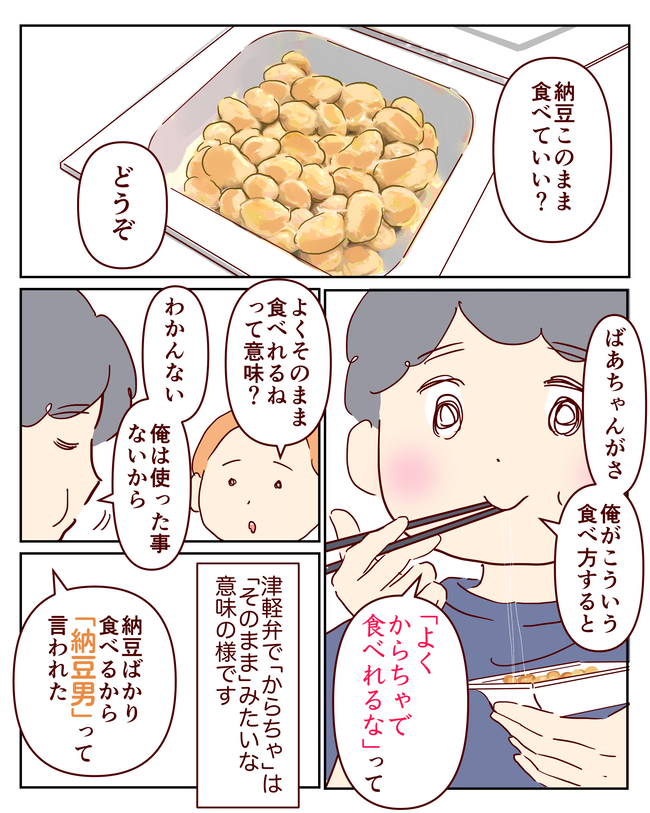 祖母の津軽弁 2025年08月11日 納豆はどちらかというと、大粒が好きです。ご飯🍚に乗せずにそのまま(からちゃ)で食べるのか、というニュアンスでしょうか。≣≣≣≣≣✿≣≣≣≣≣≣≣≣≣≣≣≣≣≣≣≣≣≣≣≣≣≣≣≣≣≣【追記】コメント欄で「からちゃ」の意味を教えて頂きました。北海道の函館でも ... 続きを読む 納豆はどちらかというと、大粒が好きです。ご飯🍚に乗せずにそのまま(からちゃ)で食べるのか、というニュアンスでしょうか。≣≣≣≣≣✿≣≣≣≣≣≣≣≣≣≣≣≣≣≣≣≣≣≣≣≣≣≣≣≣≣≣【追記】コメント欄で「からちゃ」の意味を教えて頂きました。北海道の函館でも使うそうです♩「から酒」…お酒だけを呑むこと「かっつぁ飯」…白米だけを食べること「からちゃ」…ご飯と一緒に食べないこと※「からちゃで食べないで〜」…ご飯のお供なのに(もったいないから)おかずだけで食べないで〜という意味になるそうです。ありがとうございます(⋆ᴗ͈ˬᴗ͈)”≣≣≣≣≣✿≣≣≣≣≣≣≣≣≣≣≣≣≣≣≣≣≣≣≣≣≣≣≣≣≣≣偏食の家庭でおばあちゃんに育てられ、納豆、鮭、卵くらいしか食卓に出なかったそうで育ち盛りのM少年はおかずが足りず…納豆を食べるしかなかったんだろうと推測します。鶏肉や牛肉を食べない家庭なので、子どもが大好きなハンバーグや唐揚げも知らず…かろうじて給食があったので、食べた事はあったと思いますが、あまり記憶にないそうです。最近聞いたのが「餃子🥟も知らなかった」とか。カランツ(フサスグリ)を食べていた話を最近アップしましたが、おやつもなかった。▼ 葉っぱがおやつ (2015.5) ▼ 「納豆男」の話、前に描いてました(2022.1) 孫を「納豆男」って(笑) お祖母様には1度お会いした事があります。その時、両手で手をギュッと握ってくれた事が印象的で小さなお祖母様の体ながら、力強く(Mをよろしくね)という、孫を想う温かい気持ちが伝わりました。▼ 祖母と観たドリフの思い出(2020.4)明後日はお盆。お墓参りに行ってきます💐⭐︎ クリックして頂けますと嬉しいです♪ タグ :#納豆#津軽弁#からちゃ#青森#祖母#思い出