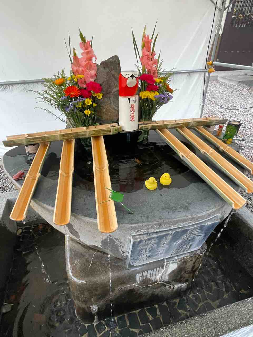 手水舎 真っ赤な鷽鳥(うそとり)が鎮座
