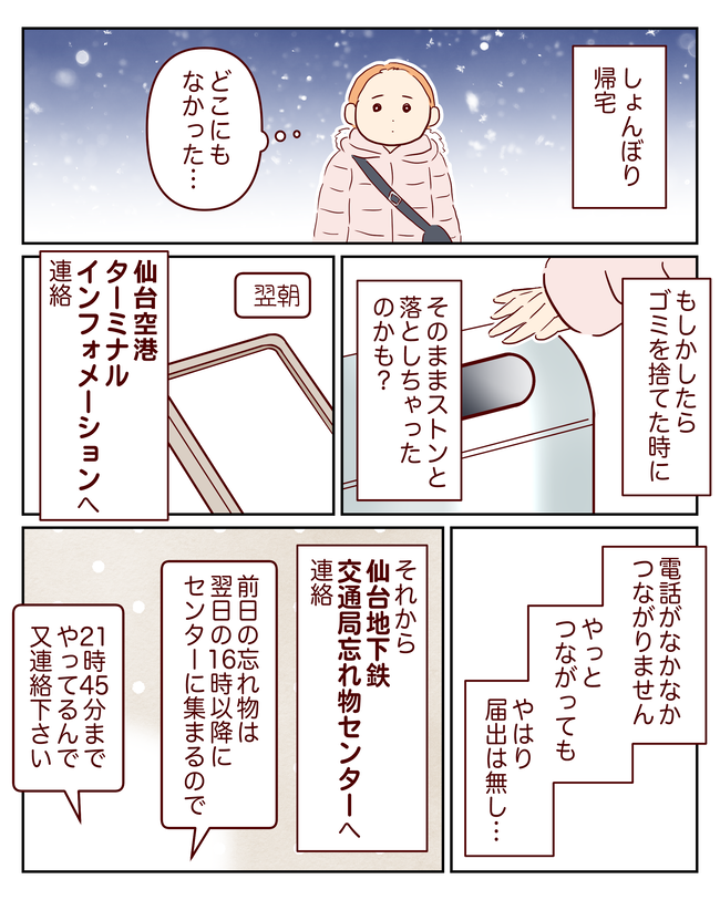 良かった!持ち主と認めて貰えました\( ´ω` )/もう…空港どころか、空港への連絡線でもなく初っ端(しょっぱな)の地下鉄で落としていたなんて!!荷物を沢山持っていて、指にまで注意が回ってなかったんですね(;'ω'∩)実家から、高速バスで移動している間はずっといじいじ ...