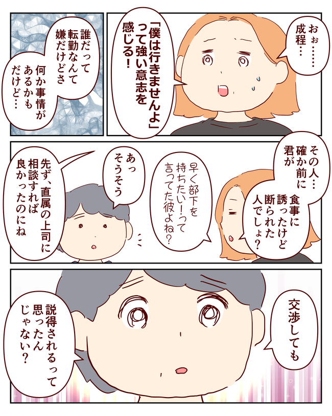 コンプラとハラ① ー繊細ー 2025年02月01日 冬期休暇の9連休後、退職代行サービスに過去最多の依頼が殺到したそうです。利用者の大多数は若い方だと思いますがネットでは好きに意見を書けるのに、実社会では「辞める」が言えない繊細さを感じました。それで思い出した話です。▼ 辞令は突然に (2024.7)▼ 人事の口説き ... 続きを読む 冬期休暇の9連休後、退職代行サービスに過去最多の依頼が殺到したそうです。利用者の大多数は若い方だと思いますがネットでは好きに意見を書けるのに、実社会では「辞める」が言えない繊細さを感じました。それで思い出した話です。▼ 辞令は突然に (2024.7)▼ 人事の口説き文句 (2024.7)去年の異動、Mの勤め先では結構な人数の入れ替えがありましたが、中には拒否反応を示す方も…東京から東北の田舎は…やっぱり嫌なのか😥知らない土地、友達もいない場所は勿論不安でしょう。単に「東北がイヤ」ではなく、チリツモで不満が溜まっていたかもしれないし以前から通院していたのかもしれないし、正確な所は分かりません。。(つづく)▼ 新人くん (2023.4) ⭐︎ クリックして頂けますと嬉しいです♪ タグ :#転勤#打診