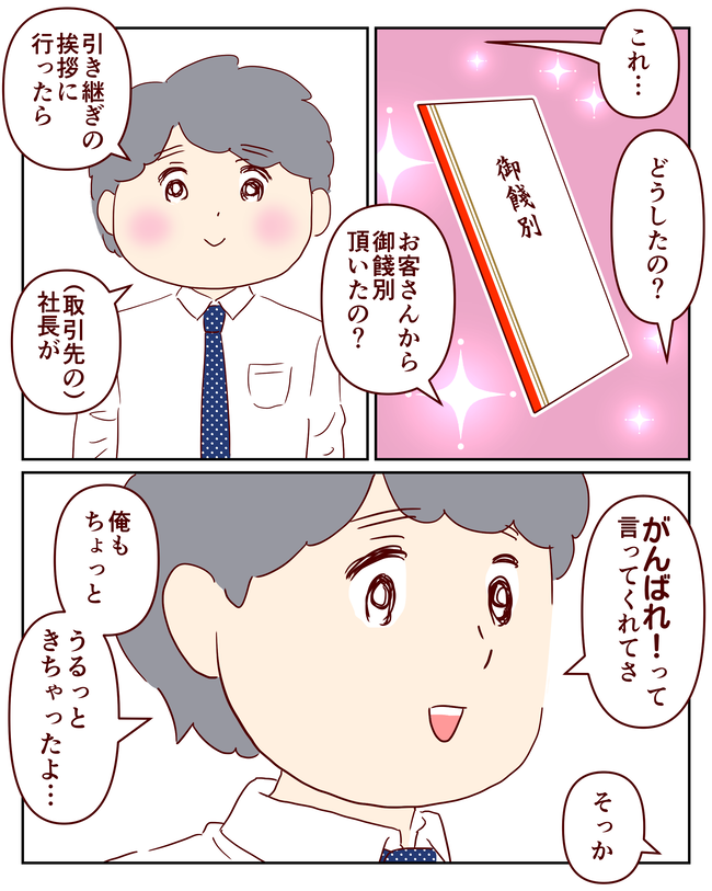 引越㉝ 揺らぐ気持ち 2024年11月27日 詳細は割愛しますが、私が聞いても(そんな事ある?)という様なお話でした。担当エリアが違うため、他支店に話を繋いだ様ですが又、仕事をしたいと連絡を頂けた事に感謝していたM 不器用ですが、他責にせず誠実で…それがどこか印象に残ったりするのかもしれないと思いました ... 続きを読む 詳細は割愛しますが、私が聞いても(そんな事ある?)という様なお話でした。担当エリアが違うため、他支店に話を繋いだ様ですが又、仕事をしたいと連絡を頂けた事に感謝していたM 不器用ですが、他責にせず誠実で…それがどこか印象に残ったりするのかもしれないと思いました。理不尽な事も、ストレスも多いでしょうが、気にかけてくれる方々がいるのが救いです。▼ 営業の仕事(2020.10) ▼ 競合(2019.11) ⭐︎ クリックして頂けますと嬉しいです♪ タグ :#転勤#挨拶#取引先