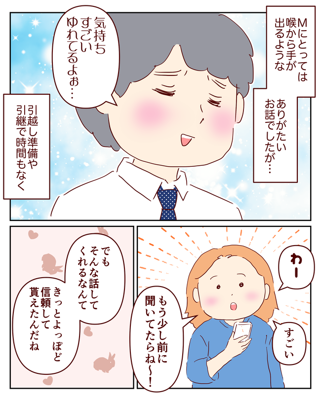 引越㉜ ご挨拶まわり 2024年11月26日 引越話…間が空いてすみません。30話超えて、まだ移動まで話が進みません(笑)さて、私が引越の片付けや梱包に追われている間、Mは引き継ぎやご挨拶まわりで大忙し。突然、舞い込んだ夢みたいなお話に(引き抜きではないです)舞い上がるM…私も少しグラつきました。(つづく)▼ ... 続きを読む 引越話…間が空いてすみません。30話超えて、まだ移動まで話が進みません(笑)さて、私が引越の片付けや梱包に追われている間、Mは引き継ぎやご挨拶まわりで大忙し。突然、舞い込んだ夢みたいなお話に(引き抜きではないです)舞い上がるM…私も少しグラつきました。(つづく)▼ 隠さない男 (2017.11) ⭐︎ クリックして頂けますと嬉しいです♪ タグ :#転勤#挨拶#餞別