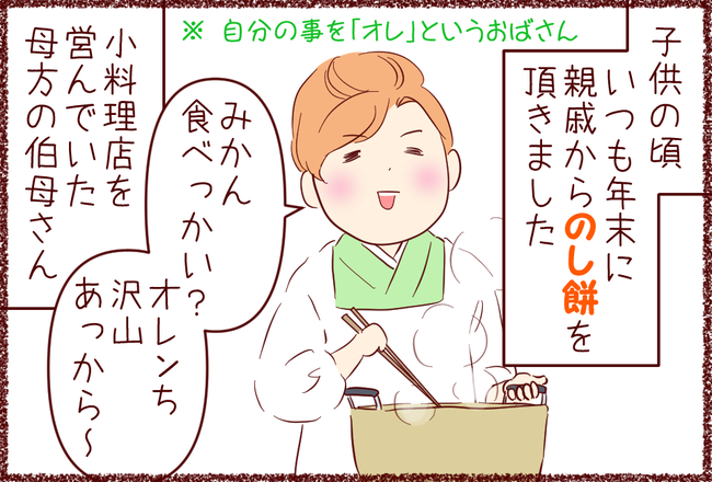 お餅の思い出 2020年01月01日 あけましておめでとうございます本年もどうぞ宜しくお願いしますお雑煮は皆さん食べましたか?私のお餅の思い出です。母のお姉さんで、俳句を嗜む伯母さんでしたが、自分の事を「オレ」と言うのが不思議でした。紙に包まれた大きな『のし餅』伯母さんは当時、ご贔屓さんや親 ... 続きを読む あけましておめでとうございます本年もどうぞ宜しくお願いしますお雑煮は皆さん食べましたか?私のお餅の思い出です。母のお姉さんで、俳句を嗜む伯母さんでしたが、自分の事を「オレ」と言うのが不思議でした。紙に包まれた大きな『のし餅』伯母さんは当時、ご贔屓さんや親戚に配るためのお餅を大量に注文していたんだと思います。市販のお餅も美味しいですが、伯母さんのお餅が懐かしいです。▼ 雑煮の思い出 ▼ 几帳面な父 クリックして↓頂けますと嬉しいです♪ タグ :#正月#思い出#雑煮#福島#のし餅#餅#食べ方